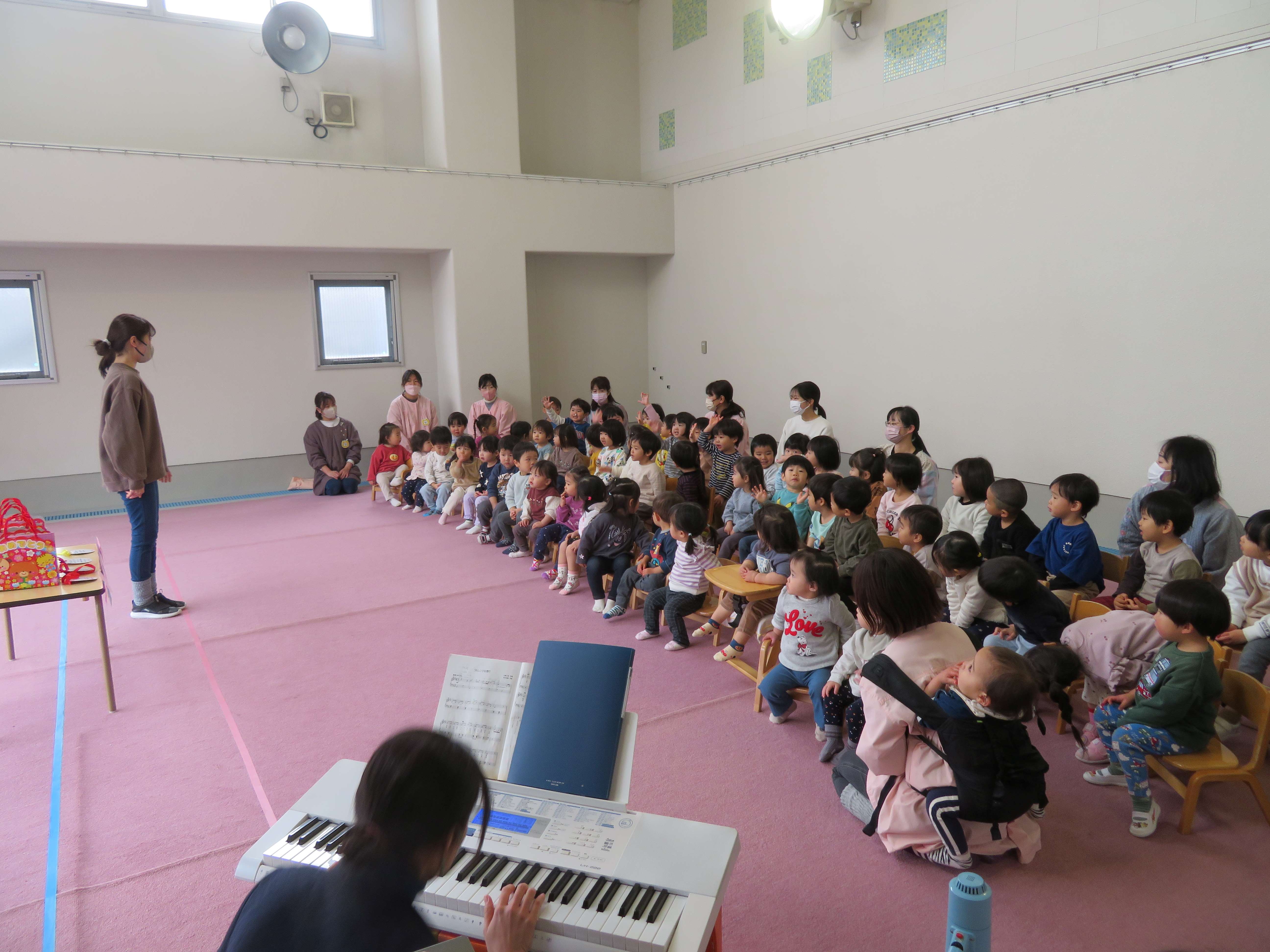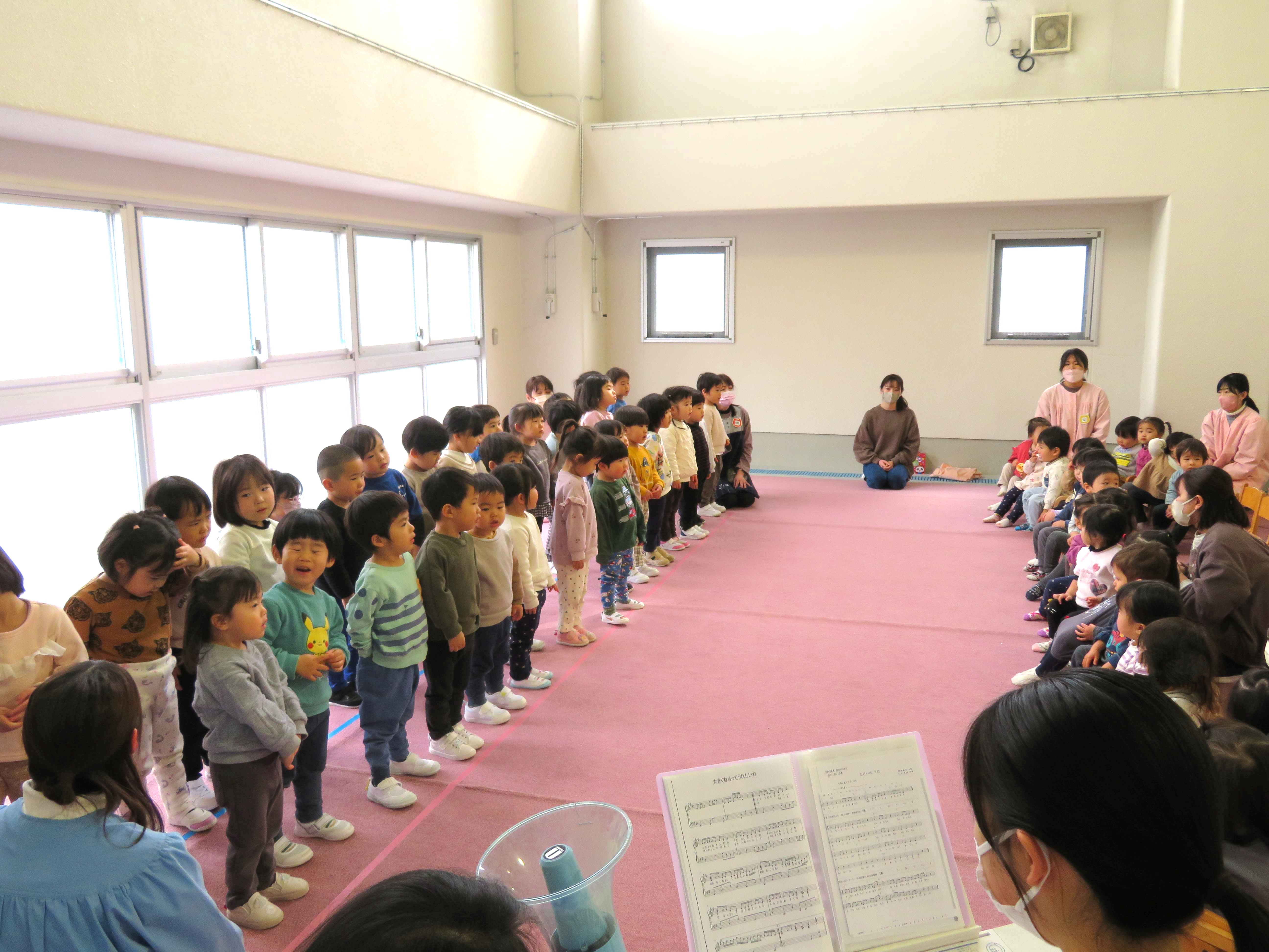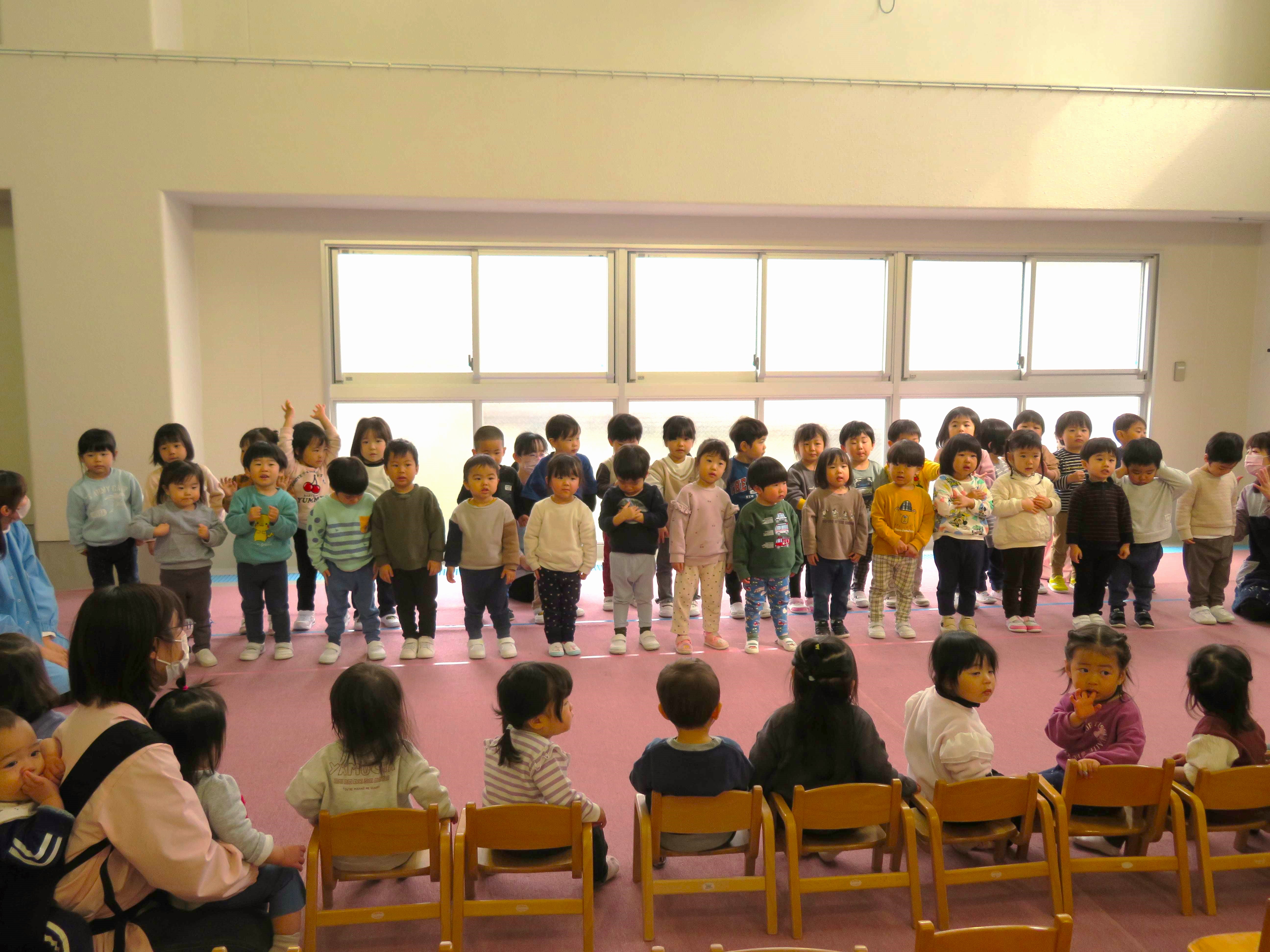 「ああ いいきもち」と「おおきくなるってうれしいね」の2曲を、先日見せていただいた以上児さんのステージを思い出しながら、のびのびと披露してくれました。
