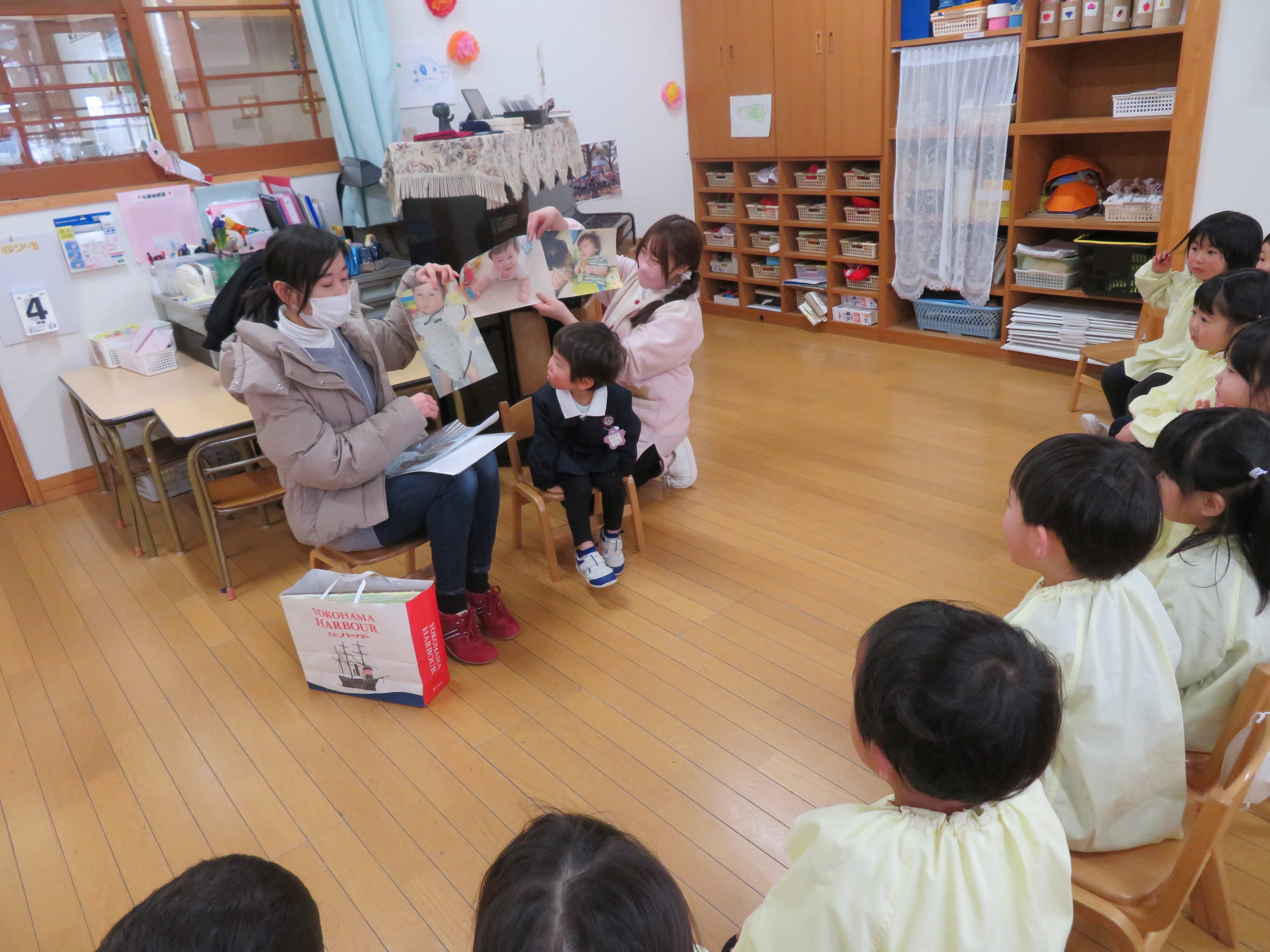 集会後はそれぞれのお部屋でお祝いです。年少さんはお家からお持ちいただいた赤ちゃんの頃の写真を見せていただきながら、お友だちの小さな頃の知らなかったお話を聞いています。