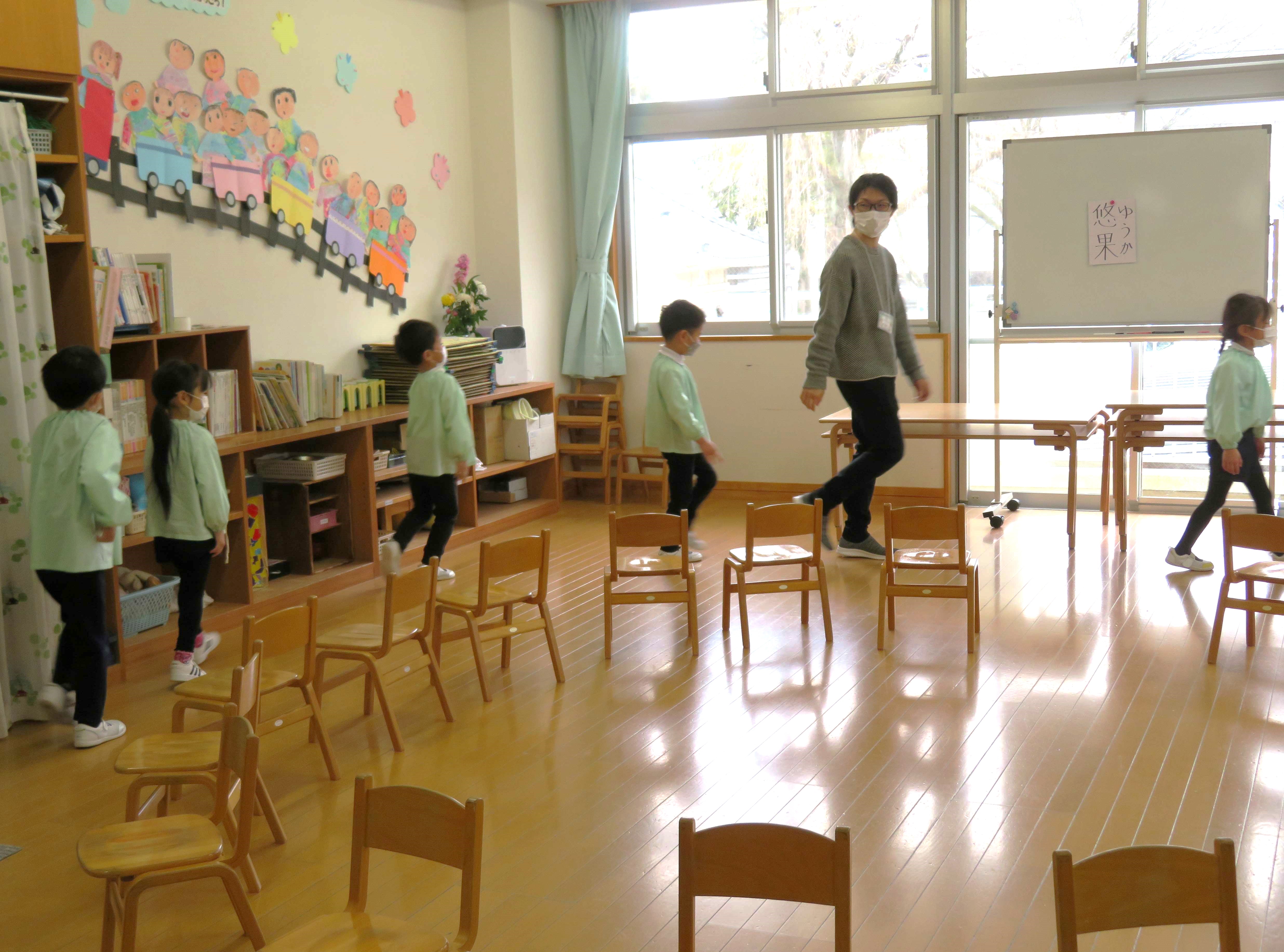 年長さんは話を聞いた後、椅子取りゲームで一緒に遊んでいただきました。