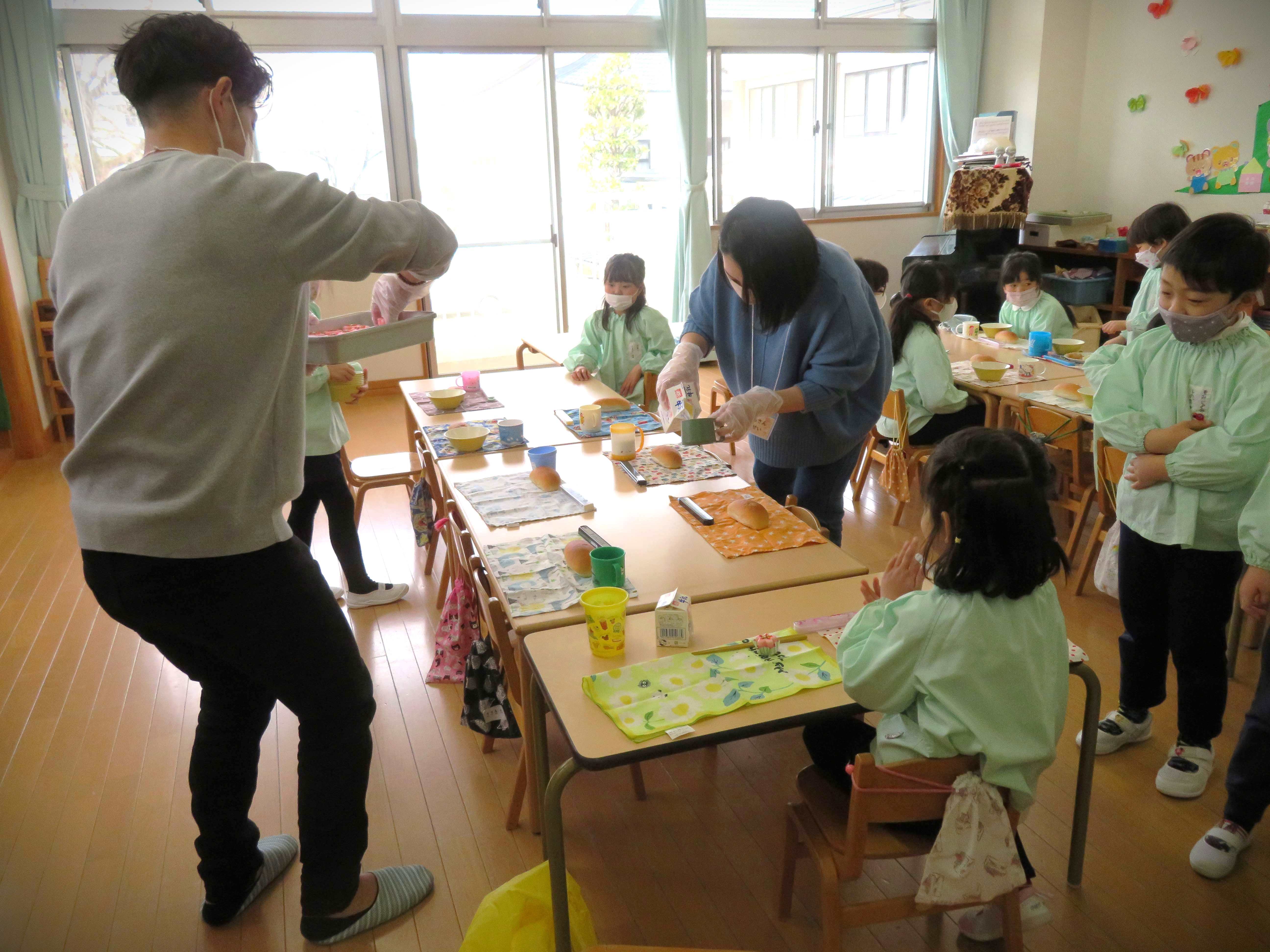 お父さん先生・お母さん先生の配膳でいただく給食です。