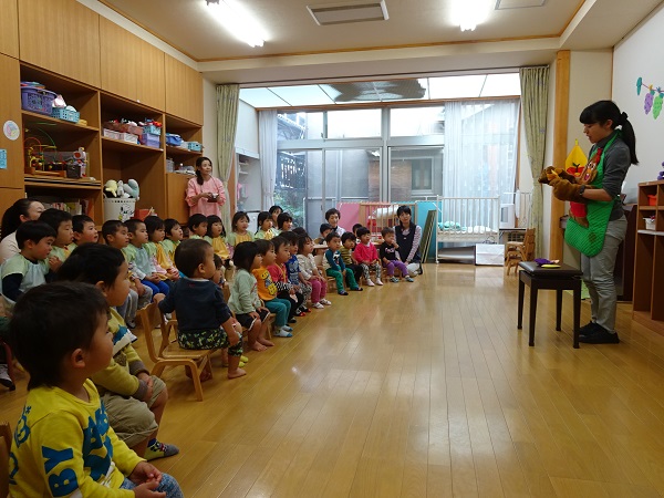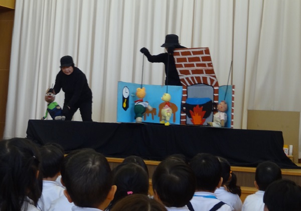 アトラクションは「3匹のこぶた」の人形劇。なんと!この日のアトラクションは園長先生がオオカミを演じてくれ、子どもたちも見入っていました。