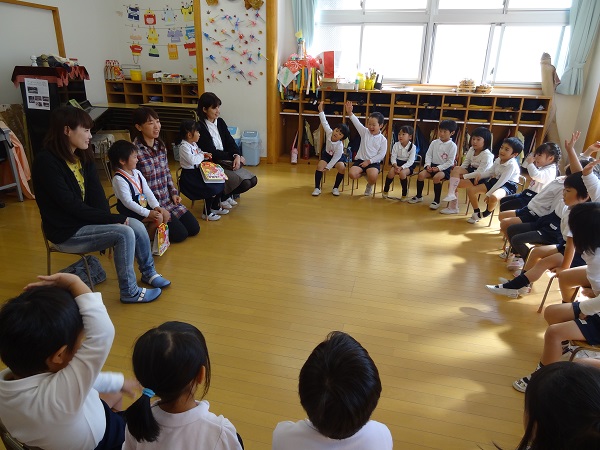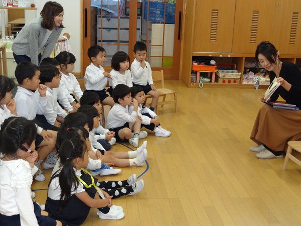 隣はその後の保育室。お子さんが生まれた時のことを綴った絵本を、子どもたちに読んで見せてくださるお母さんと、お話をじっと聞いている年少さん。