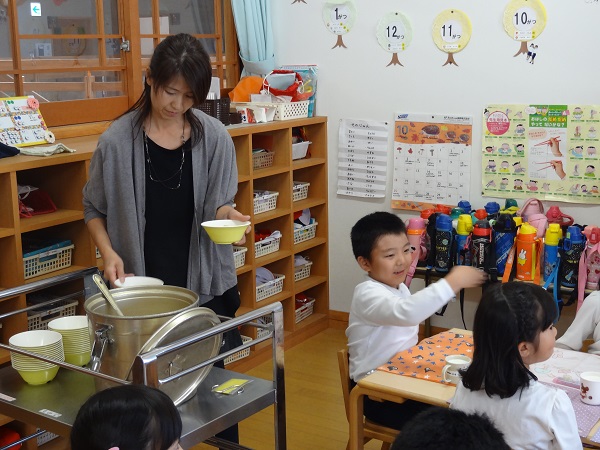 その後の給食では、配膳をしてくださいました。これからの時間は「○○ちゃんのお母さん」ではなく「○○先生」として子どもたちとかかわっていただきました。(年長さん)