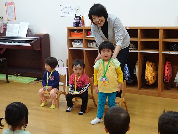 未満さんの誕生会。1歳から2歳へ、2歳から3歳へ大きくなりました。ペンダントをかけてもらい、みんなが声をそろえて「おめでとうございます」を言いました。