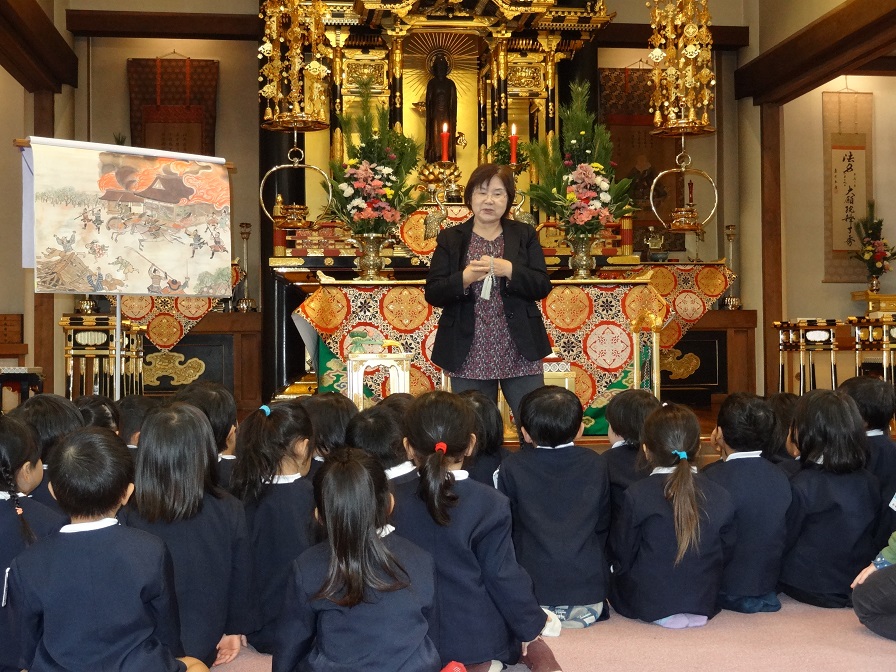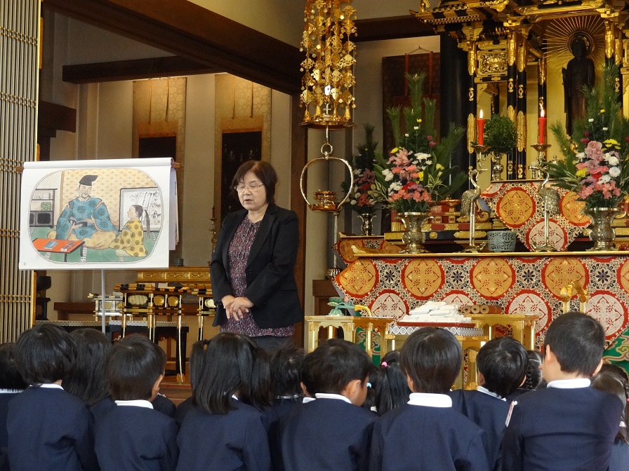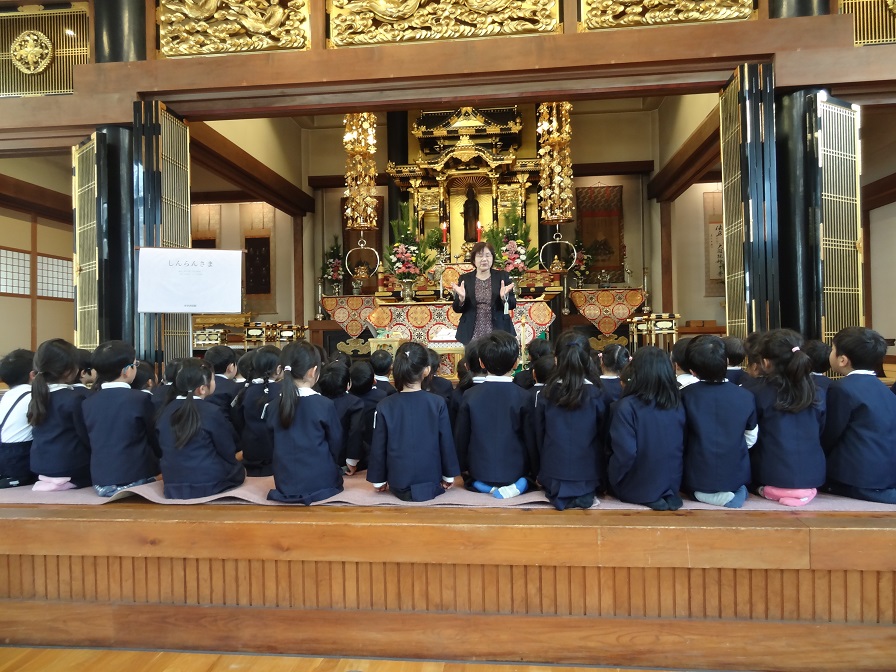 子どもたちは学年ごとに善勝寺の本堂に集まり、園長先生からしんらんさまのお話をお聴きしました。