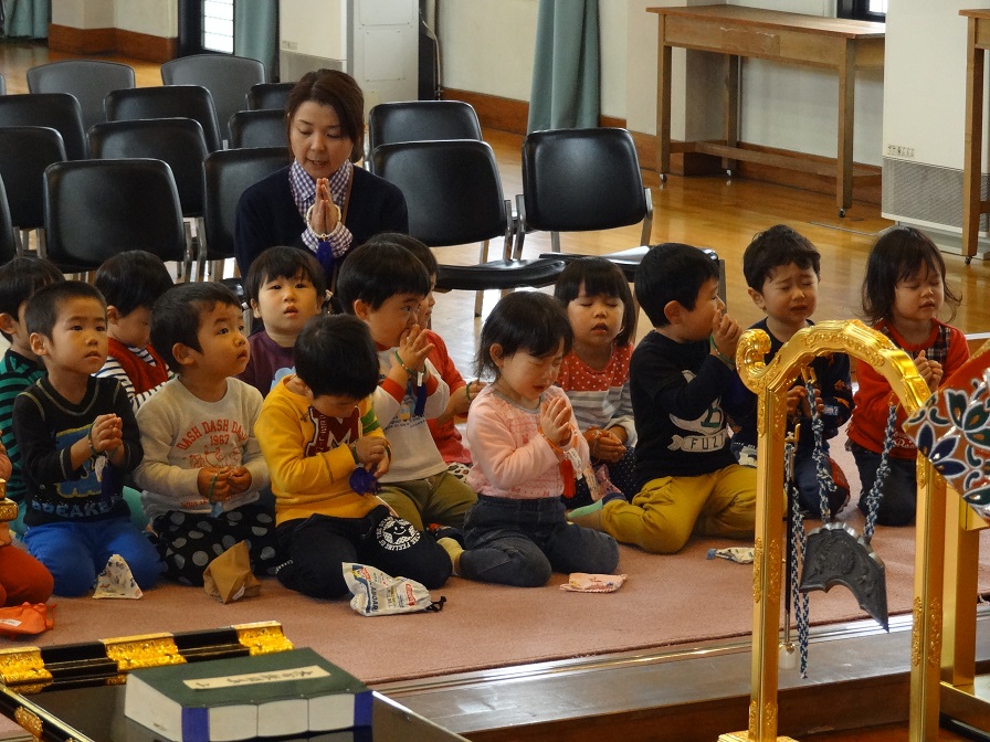 最後は年長さんです。年長になると背筋もピンと伸び、30分近く静かにお聞きすることが出来、3年間の積み重ねをそこに感じました。少し難しい話も結構真剣に聞いていました。