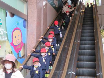 エスカレーターに乗って帰ってきました。約束通りしっかり手すりにつかまっていますね。
