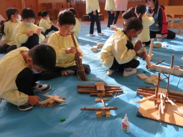 年長さんは遠足でいただいてきた枝や木片で好きなものを作っています。