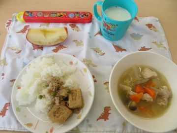カミンちゃんの絵が付いた高野豆腐の甘辛煮、汁の中のごぼう・しめじなど、デザートの皮つきりんご(しなのほっぺ)などよく噛んで欲しい食材を使っています。
