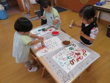 2歳のお友だちは、葉っぱの形のスタンプをペタペタ・・・木に紅葉した葉っぱが沢山スタンプされています。