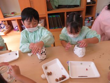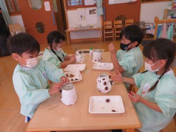年中さんは、拾ってきた木の実や枝などを付けて花瓶や筆立てを作っています。