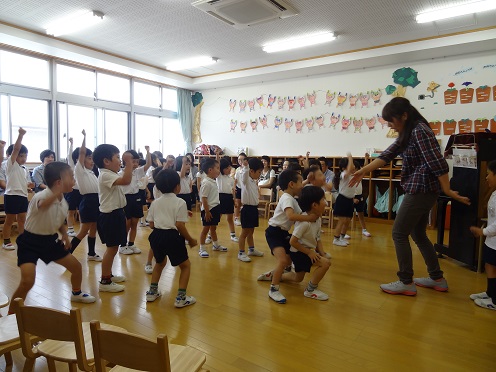 初めての参観、年少さん。お母さん方の見守る中、元気に活動してました。