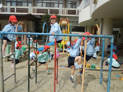 クラス替えのあった年中さんも、新しい友だちと一緒に元気に庭で遊んでいます。