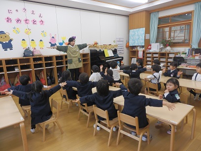 入園したばかりの年少さんだって、先生を中心にしてお部屋で手遊びを楽しめるようになってきました。