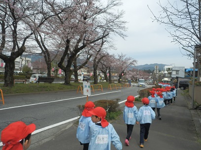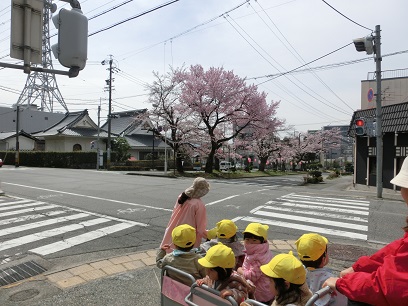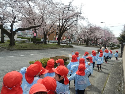 年中さん達も出かけました。大宮通りを桜を見ながら散策。「春だねー」「きれいだねー」桜並木に子どもたちの歓声が響いていました。
