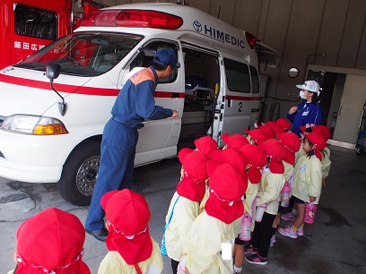 外の緊急車輌だけでなく、署内も見せていただきました。子どもたちは興味津々。救急車も見せていただきました。