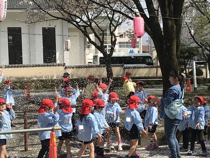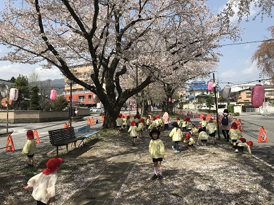 例年よりも早く満開になった桜。4日(水)午後、年中さんと年長さんが、園前の大宮通りにお花見に出かけました。