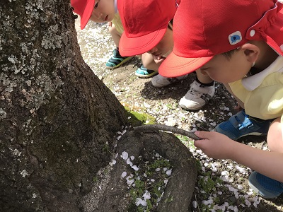 暖かい午後、すでに散り始めた花びらの下で大喜びの子どもたち。動いていたのは子どもたちだけでなく、蟻たちも。木の根元に集まって観察が始まりましたよ。