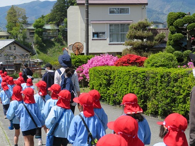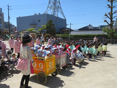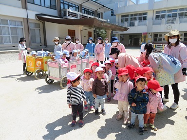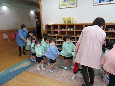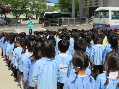 年少さんは電車になって避難しました。上履きのまま外に出ます。
