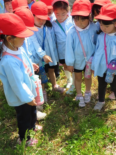 芋畑の横は竹藪。畑の脇に小さな筍を見つけました。「根っこがつながってるんだって!」