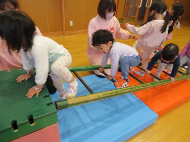 雨の日でも体を動かして遊んでいます。遊戯室に巧技台やマットを広げて遊んだ2歳児さん