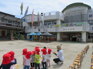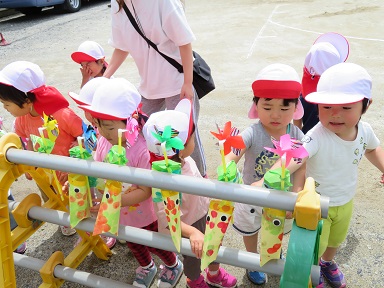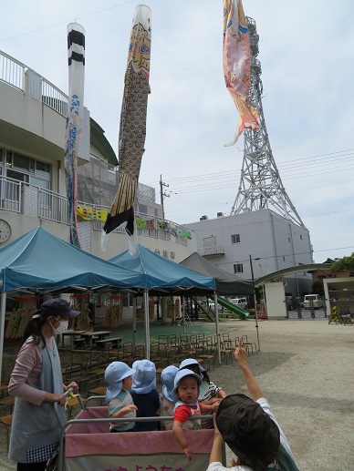 周囲に飾ってある大きなこいのぼりは、卒業した年長児が作ったものです。大きなこいのぼりが皆の応援をしてくれていました。