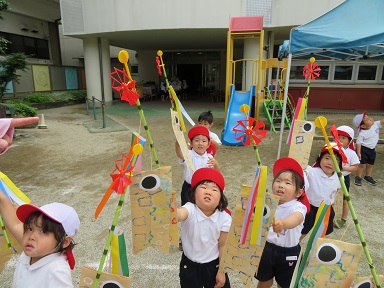 風を受けて風車が回ります!「ほら見て、回ってるよ!」