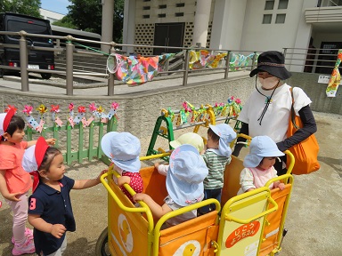 つくしさんも散歩車に乗ってこいのぼりを見て回りました。