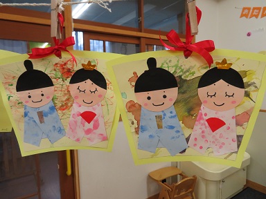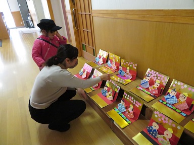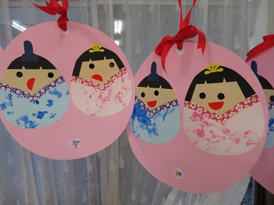 年長さんのおひな様はドーム型のお家に入っています。 にじみ絵の着物です。