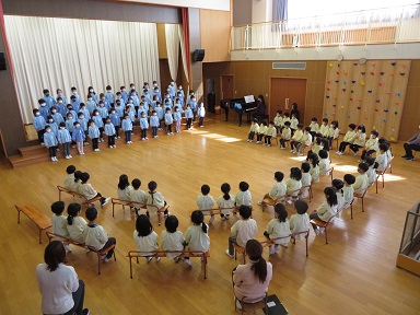 年長さんは「大きな歌」「HappyChildren」「さよならぼくたちのようちえん」の3曲、年少年中は「虹のむこうに」を1曲歌い、お互いに聞き合いました。