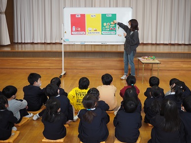 栄養教諭の横田先生から、大きく3つに分けられた「食べ物の栄養」について学びました。