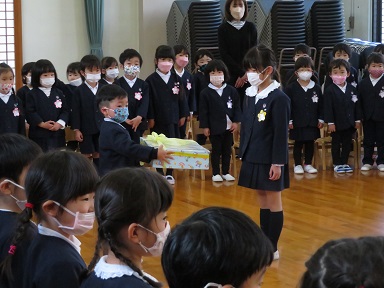会の終わりには、年中さんから卒業生へのコサージュのプレゼントが渡されました。
