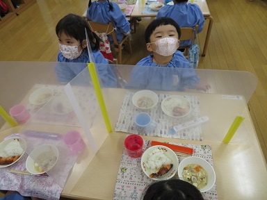 年少さんも皆に配膳されるまで待てるようになっています。給食の先生からの献立に関するお手紙を読んでもらってから、皆揃って「いただきます」をします。