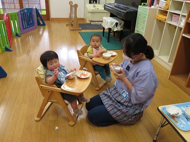 1歳児のお友だちもテーブルにパテーションを立てて給食やおやつを頂きます。自分で食べたい気持ちが出はじめているようです。