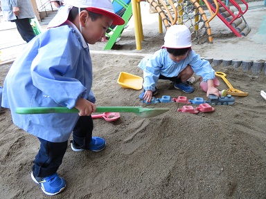 同じ砂場で自分も友だちもそれぞれにやりたい遊びに取り組んでいます。