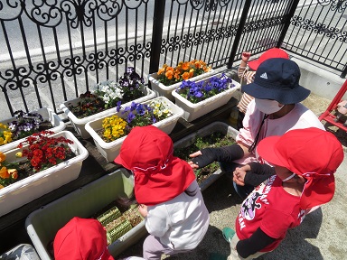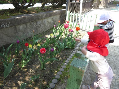 昨年度の年中さんが植えた花壇のちゅーりっぷが咲き始めています。赤・紫・黄色・ピンク、、、沢山の色が咲いています。