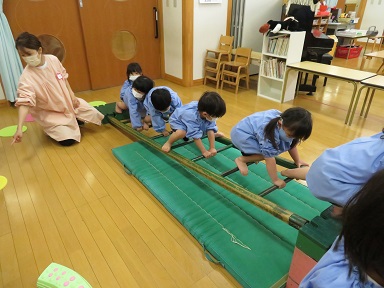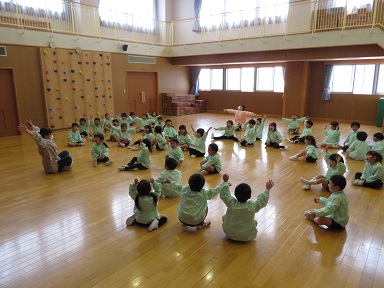 年中さんは2クラス一緒に体操をしています。「ぞうさんのあくび」の大きな声が聞こえてきました。