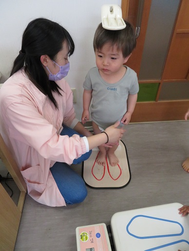 2歳児の友だちは身体測定をしました。初めて計器に乗りました。測定前後の着替えも先生に手伝ってもらいながら自分でやってみました。