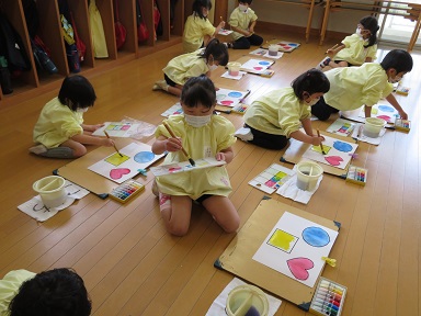 年長さんは初めての絵の具。自分の絵の具からパレットに色を出して塗ってみました。