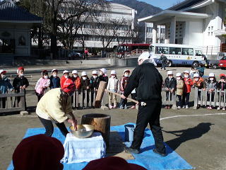手返しは担任の先生、杵を持つのはスクールバスの運転手さん、用務員の先生、事務長と職員総動員で行いました。 |