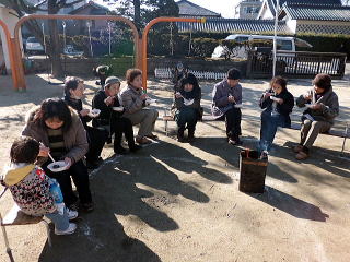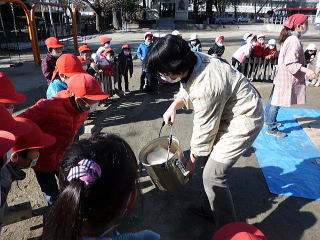 | 12月20日(木)、新年を迎える年末の行事、おもちつきがありました。今年は未就園児親子登園に参加されている「さくらんぼ組」の皆さんや地域の方にも参加していただきました。「そーれ!」「ヨイショ!」と子ども達の元気な掛け声が庭いっぱいに響いていました。 |