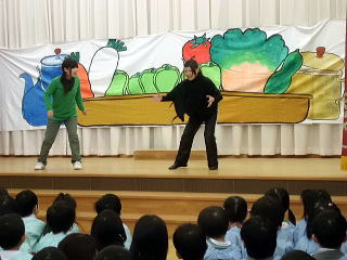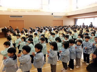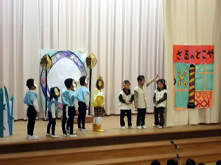 | 12月5日(水)、劇とリズムの会が遊戯室で行われました。年中は歌と合奏、年少は歌遊び、そして年長は劇を行いました。来園された保護者などの大勢のお客様に拍手をいただき、子どもたちは表現することの喜びをますます強くしていました。 |