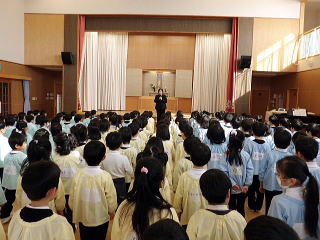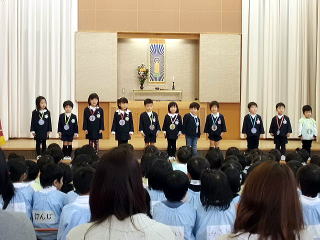| 12月17日(月)、12月生まれのお友だちの誕生会がありました。12月生まれは11人、ステージに並び園長先生より一人ひとりペンダントを掛けていただき、みんなでお祝いしました。 |