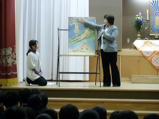 お釈迦様がお悟りを開かれるまでのお話を掛図を見ながら聞きました。 |