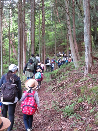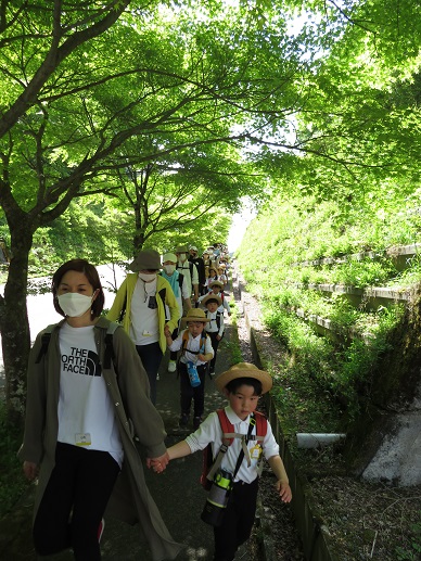 山の中の探検をしながら、お家の方と手をつないで頑張って歩きました。