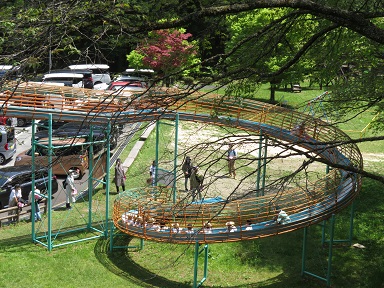 年長さんは山田体育館から、かえでアンサンブルロード~遊歩道を歩いて公園へ向かいました。途中の山道はかなりの上り坂。