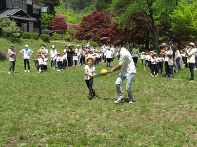 年長のレクでは、親子の触れ合い遊びやクラス対抗ボール運びリレーをしました。