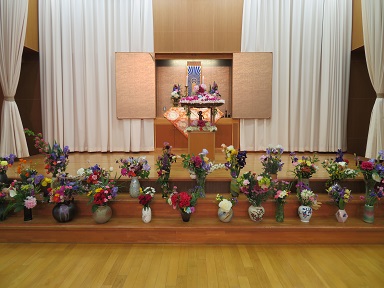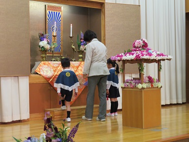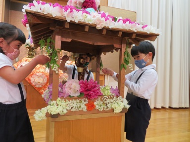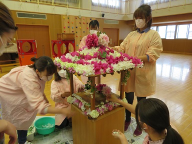 早朝、持ち寄ったお花で、先生たちがお花御堂を飾り付けました。