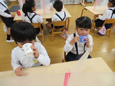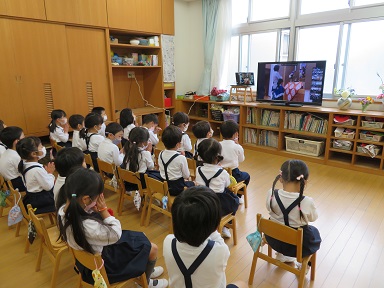 新型コロナウイルスの感染が収まらないので園児が遊戯室に集まっての集会はせずに各保育室でリモートで行いました。