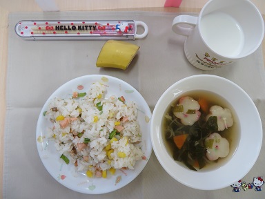 給食は、はなまつりの花を意識した献立「花ずし・お吸い物・バナナ・牛乳」でした。花まつりにちなんで、お吸い物のお麩は花の形、花ずしには、コーンの黄色・鮭の赤・エンドウの緑がきれいでした。